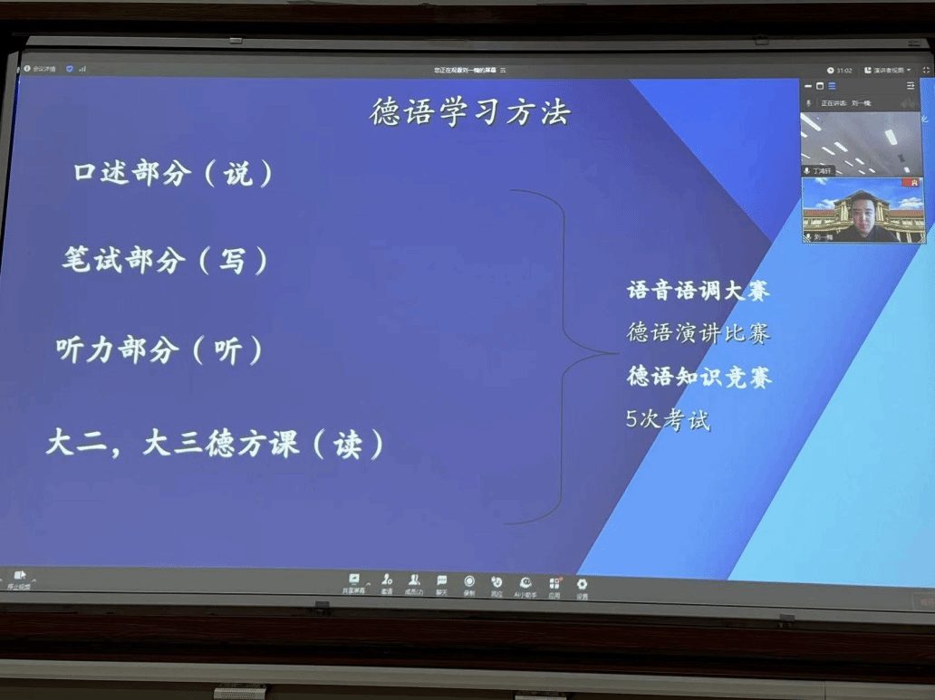 随后,2018级校友刘一楠通过线上的方式以“你的生活指南”为主题,从个人简介、学在中德、乐在中德、学习方法指南、答疑解惑五个方面进行了分享。刘一楠目前在德国汉堡大学读研,他给大一新生分享了自己在OK138太阳集团的学习经历,尤其是乐在中德,分享了OK138太阳集团形式多样的活动——中德文化节、德语角、德语学习经验分享会、Exzellenzprojekt、中德朗读者、学习沙龙、演讲比赛、语音语调大赛、篮球赛、足球赛、啦啦操比赛等独具中德特色的活动。分享了自己总结的德语及专业课程学习方法和经验,并告诫大家大一基础好,大二大三没烦恼,早睡早起身体好,课堂效率见奇效。