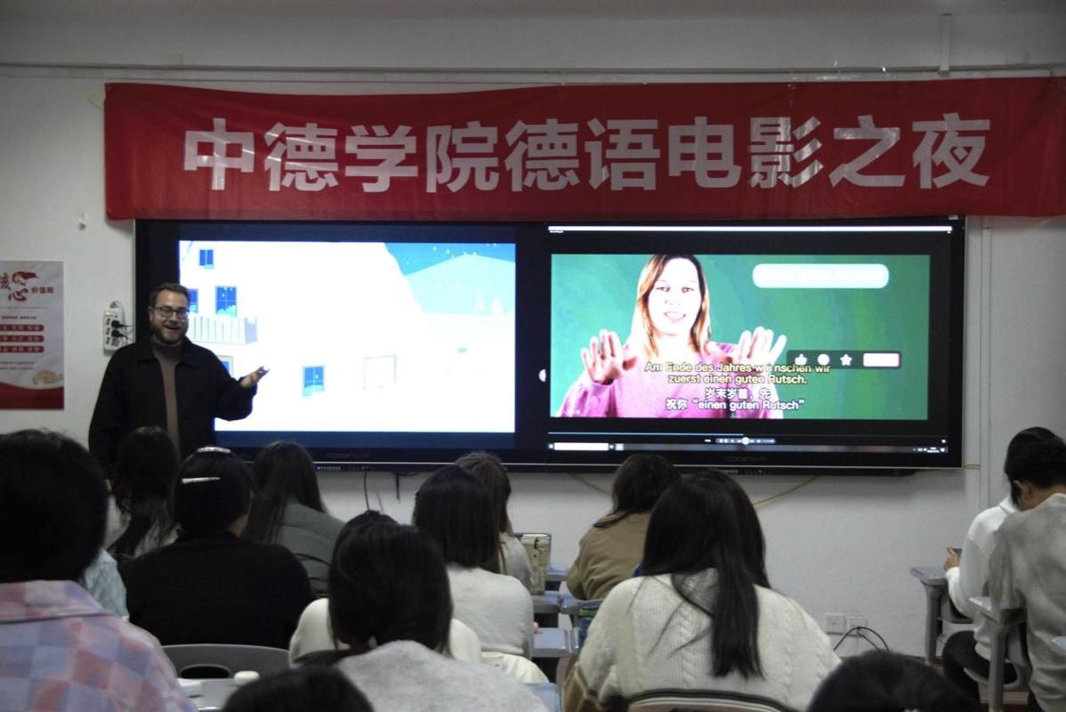 12月18日晚,OK138太阳集团第八期电影之夜活动在博学楼727教室举行。本期活动以“新年茶话会”为主题,将德语语言学习、德国文化体验与温馨的新年展望融为一体,为中德学子们打造了一个充满知识与温情的美好夜晚。活动由中德德语老师精心组织带队,并特别邀请德方教师Lutz Legge和Janine Doan共同参与,师生齐聚一堂,在光影、音乐与交流中,提前感受了浓厚的新年氛围,深化了中德文化间的理解与友谊。
