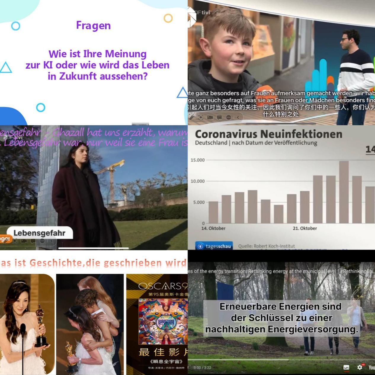 此外,在本学期的课程中我班增加了每天做报告的环节,由学生任选某一主题,上台对该主题进行三分钟左右的演讲,结束后和听众就该主题进行提问交流。刚开始大家选的题目多是关于家乡,美食或旅行等相对简单的话题。随着语言学习的不断深入,大家的选题逐渐丰富起来,例如:可再生能源,新冠对生活的影响,Chat GPT,柏林电影节,奥斯卡金像奖... 在这样的环节中,大家既可以用德语追踪时事,扩充词汇量,又能提高德语听力,激发大家学习的兴趣。