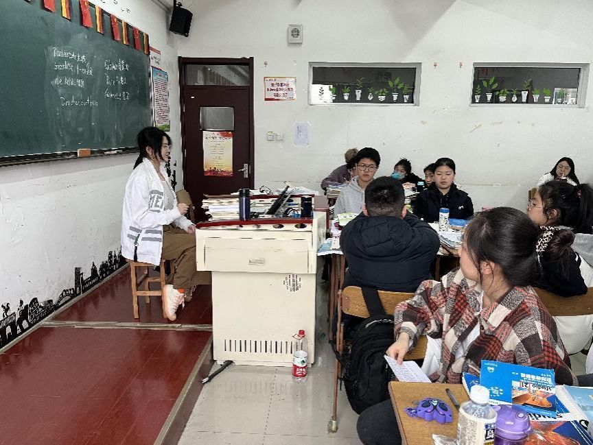 在本学期初,我也邀请了即将毕业的优秀学姐王艺萌来我班,做了学习经验交流报告。王艺萌同学从学习动机,学习方法和效率,职业规划等方面向同学们传授了语言学习经验,鼓励大家迎难而上,夯实好德语基础,为之后的专业课学习打好基础。