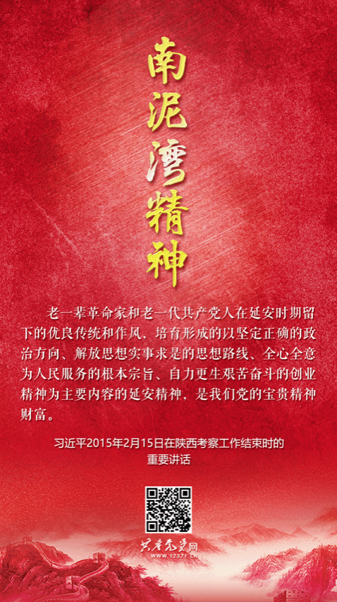南泥湾革命旧址位于延安城东南45公里处,是中国共产党军垦事业的发祥地,是南泥湾精神的诞生地。在抗战时期异常困难的情况下,八路军第三五九旅响应党中央号召,一手拿枪、一手拿镐,发扬自力更生、艰苦奋斗的精神,奔赴延安东南四十多公里的南泥湾垦荒屯田,把昔日荆棘遍野、荒无人烟的“烂泥湾”变成“到处是庄稼,遍地是牛羊”的“陕北的好江南”,为人民军队和抗日根据地树立了“自己动手、丰衣足食”的光辉旗帜,形成了宝贵的南泥湾精神。作为中国共产党人精神谱系的重要组成部分,南泥湾精神成为鼓舞和激励全党全国各族人民风雨无阻、勇敢前进的强大精神动力。